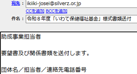 ※ 件名に要望する事業名(「いわて保健福祉基金」または「ご近所支え合い活動助成金」)を