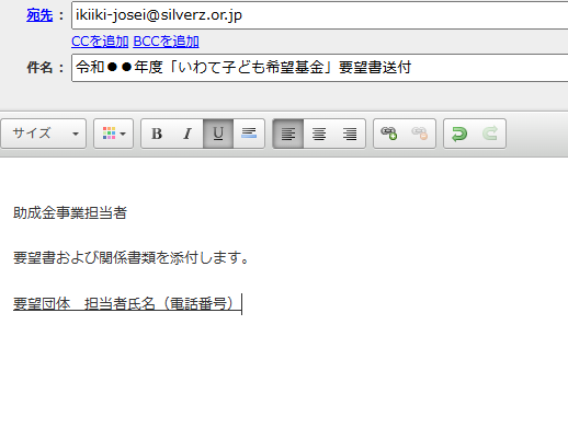 「助成金交付要望書」のデータ(Excel)及びその他必要書類(PDF)を電子メールにてデータ送信してください。
